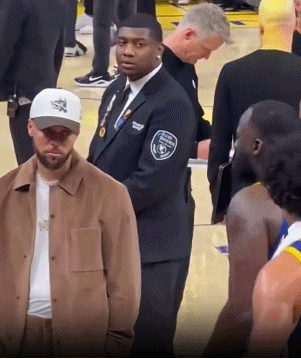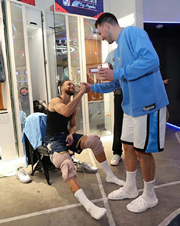 全明星前勇士对湖人的比赛中,库里几乎整场都站在替补席为队友加油。